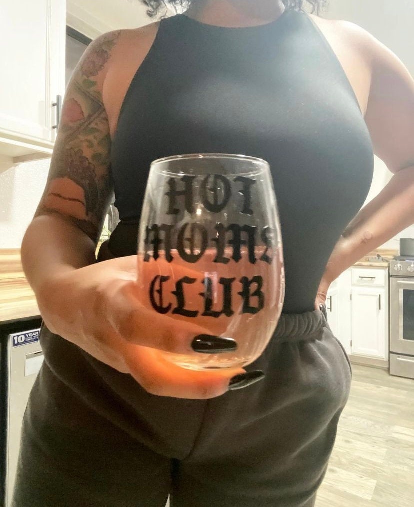 Clear wine glass with Hot Moms Club.
