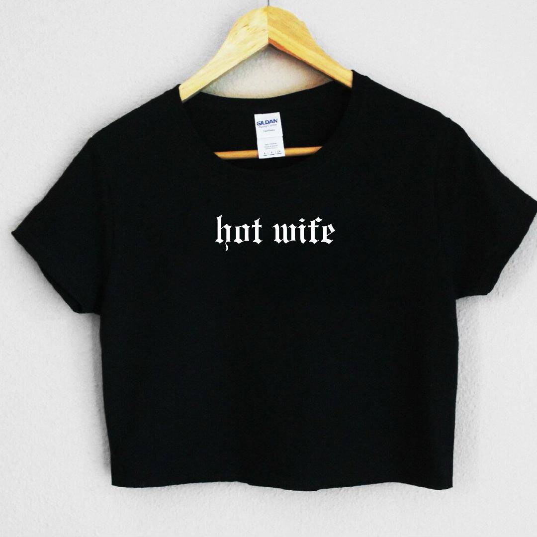 This crop top is vinyl printed with "hot wife" with a raw cut hem.