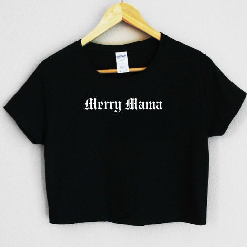 This crop top is vinyl printed with "Merry Mama" with a raw cut hem.