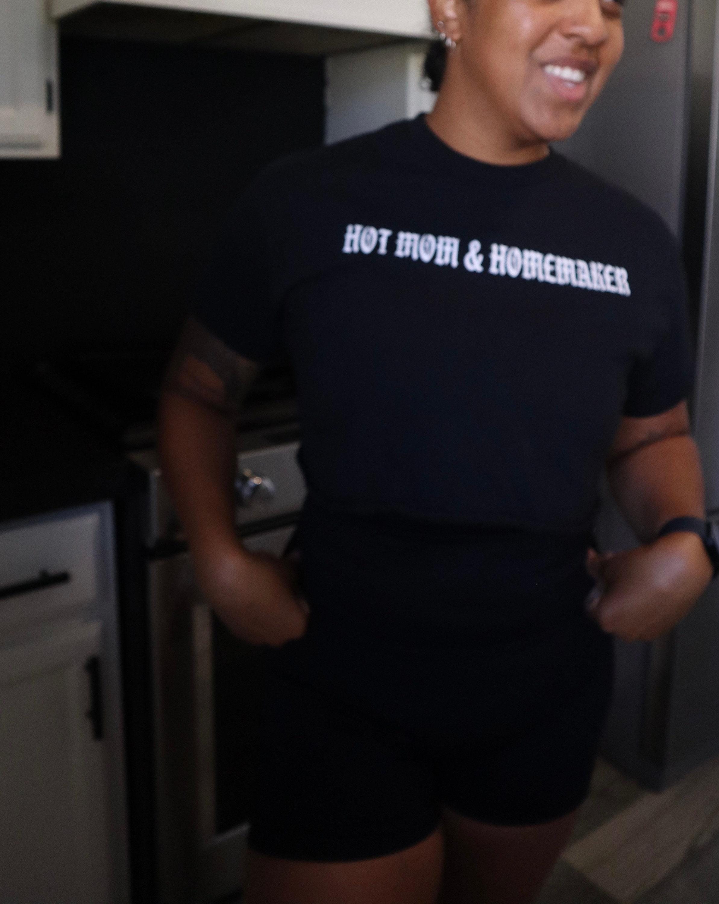 This crop top is vinyl printed with "Hot Moms & Homemaker" with a bottom cut raw hem