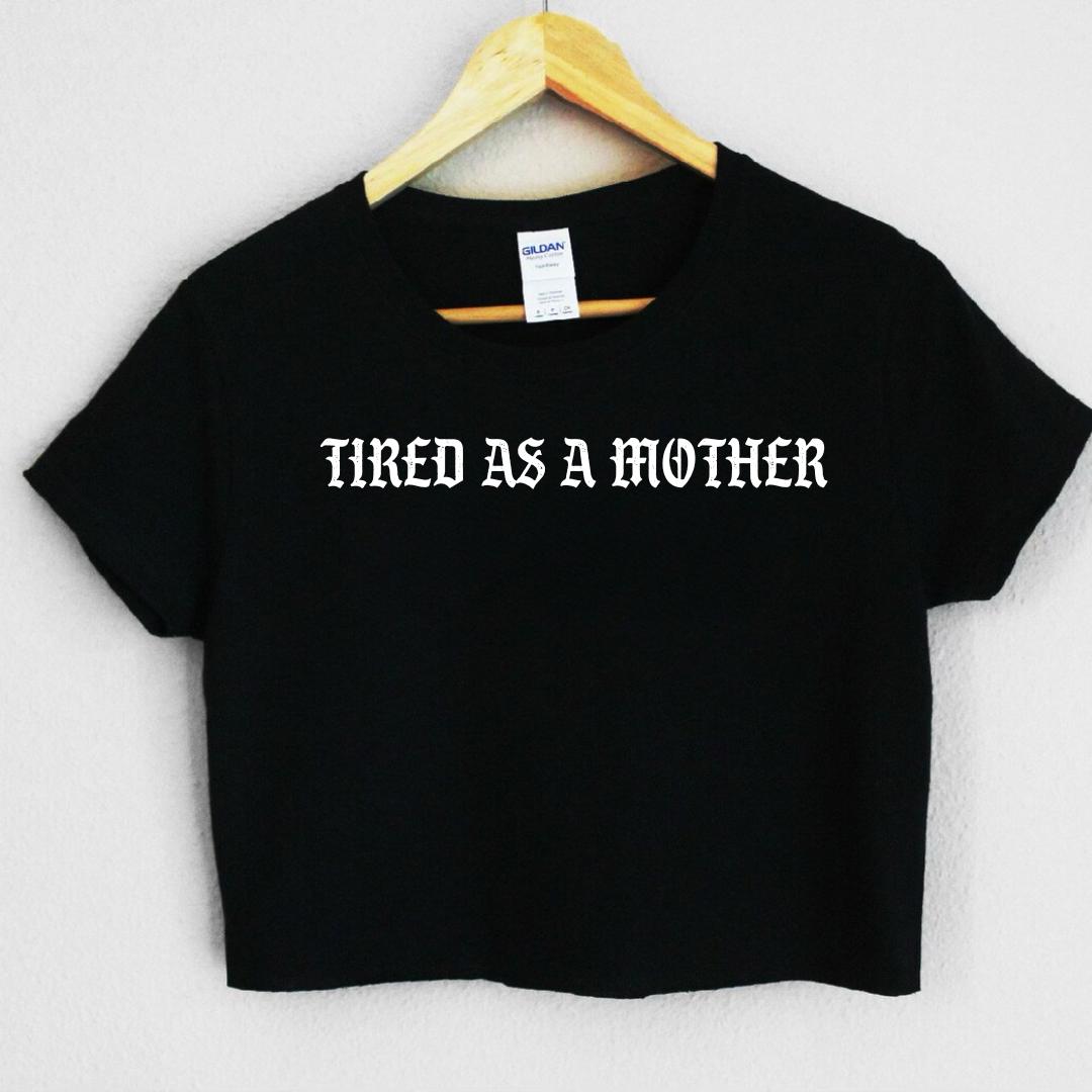 This crop top is vinyl printed with "TIRED AS A MOTHET" with a bottom cut raw hem
