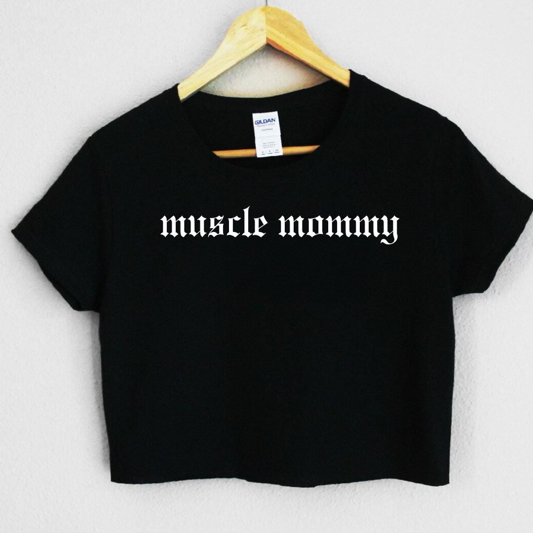 This crop top is vinyl printed with "MUSCLE MOMMMY" with a bottom cut raw hem